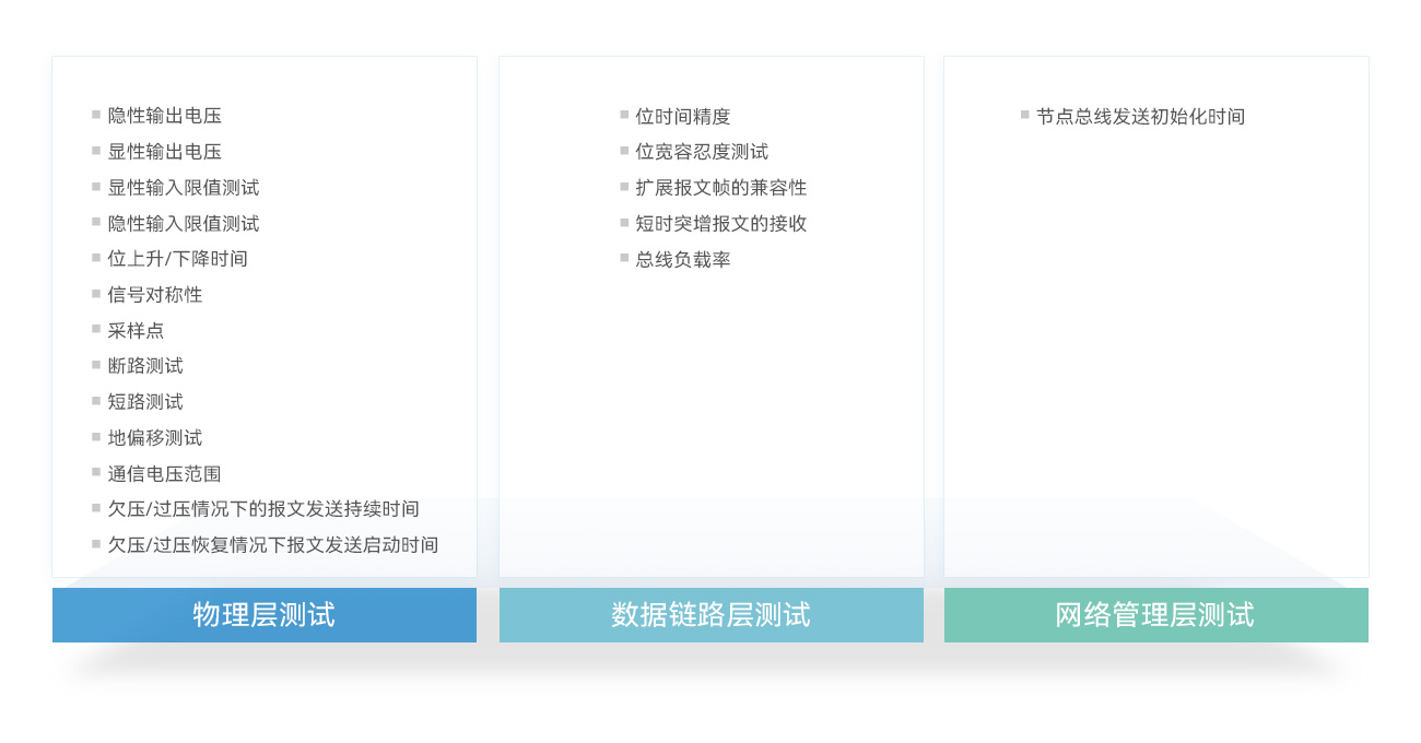 CAN一致性測試系統(tǒng)以ISO11898標(biāo)準(zhǔn)為核心,圍繞國內(nèi)主流新能源主機(jī)廠CAN總線測試標(biāo)準(zhǔn)為主要依據(jù),測試功能滿足物理層、鏈路層、應(yīng)用層的測試需求。
