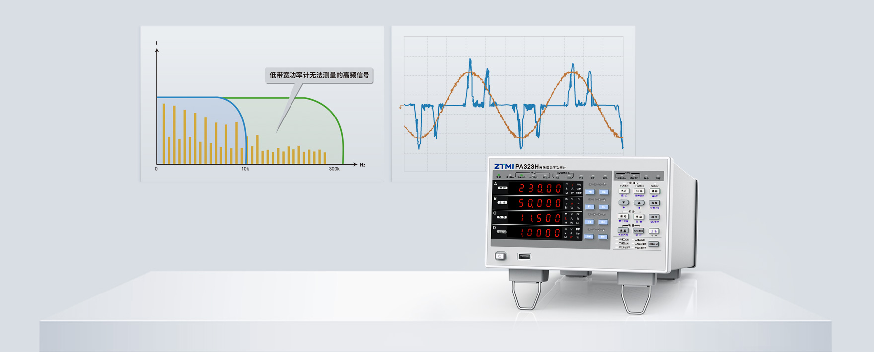 在面對存在畸變的信號時,普通功率計因帶寬與采樣率的限制,無法測試其中高頻諧波分量,測量值與真實值存在巨大差距。PA323H數字功率計具有300KHz帶寬,能夠涵蓋畸變波形中的高頻諧波分量,準確測量其功率因數及功率。