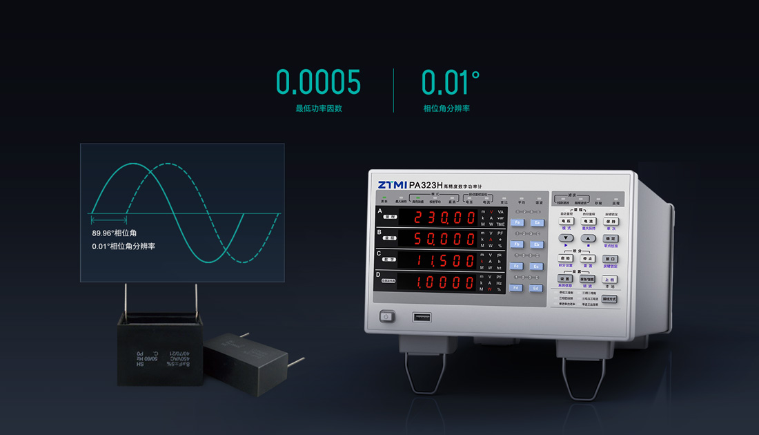 PA300系列數字功率計采用100MHz同步時鐘,相角分辨率高達0.01°。即使在低至0.0005的功率因數下仍能保證0.1%的高測量精度。