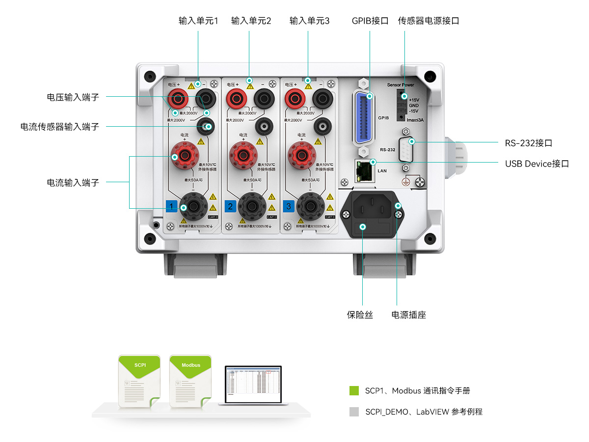 通訊接口是數據通訊的硬件基礎。PA300系列功率計標配LAN、GPIB、RS-232和USB Device接口,兼容SCPI、Modbus兩種通訊指令,保證了測試設備在自動化產線測試的系統集成中具備良好的兼容性。
