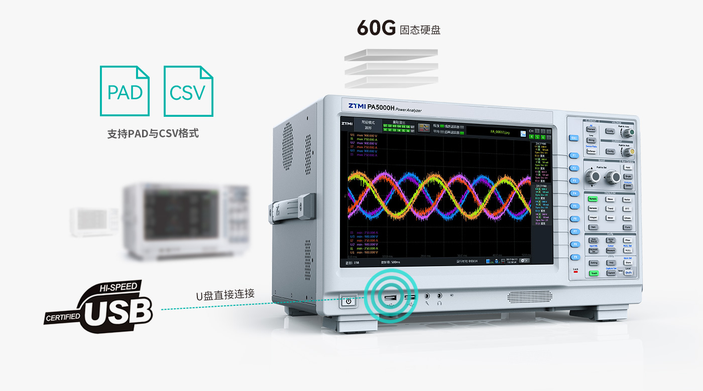 PA5000H功率分析儀擁有高達240G的固態硬盤可以海量存儲數據,用戶更可以直接連接U盤將想要的數據全部儲存,PAD與CSV格式多樣支持、存儲時間隨意控制,讓存儲再也不是難題。