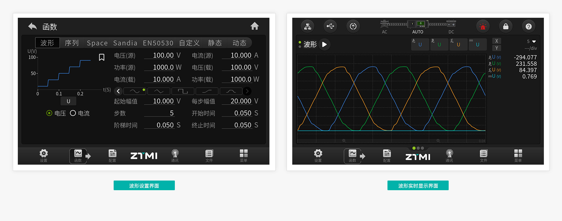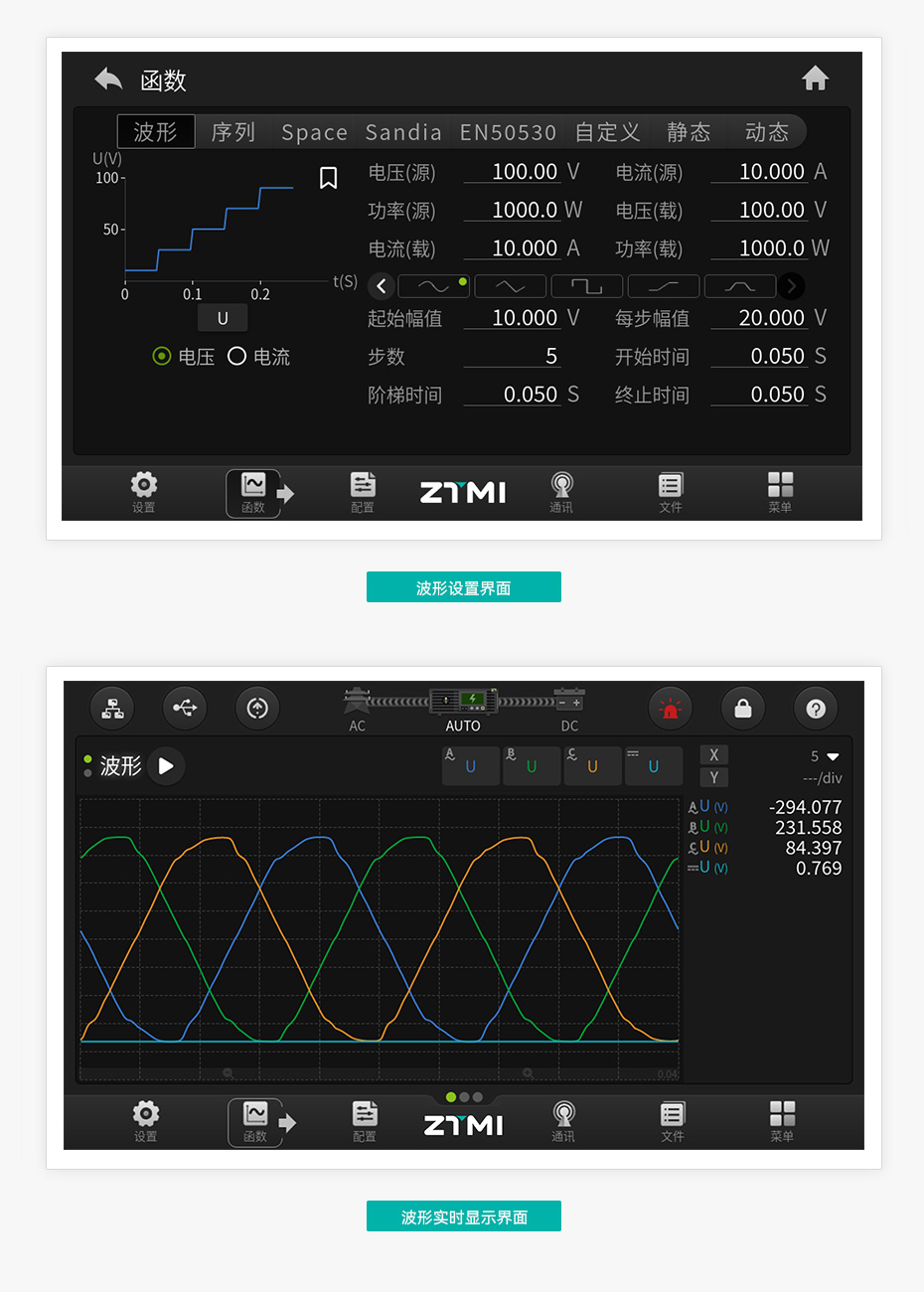 PSD8000 將“效率為先”融入產(chǎn)品設(shè)計。設(shè)備波形庫內(nèi)置豐富的常用測試波形,用戶可以通過拖動的方式快速將各類波形進行序列編程,界面下方會直觀的展示序列變化;點擊輸出后,界面將自動切換為波形實時顯示界面, 可以顯示 U、I、P、R 等參數(shù)。如此可將波形設(shè)置及波形顯示深度串聯(lián),令測試更加流程化。