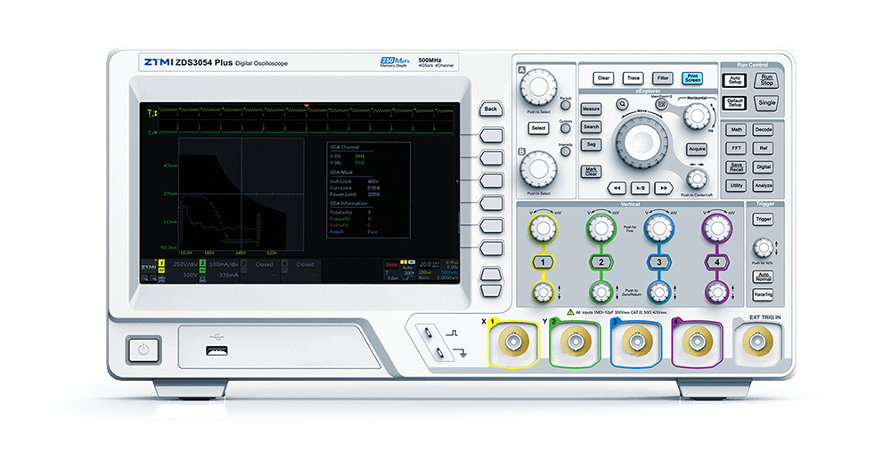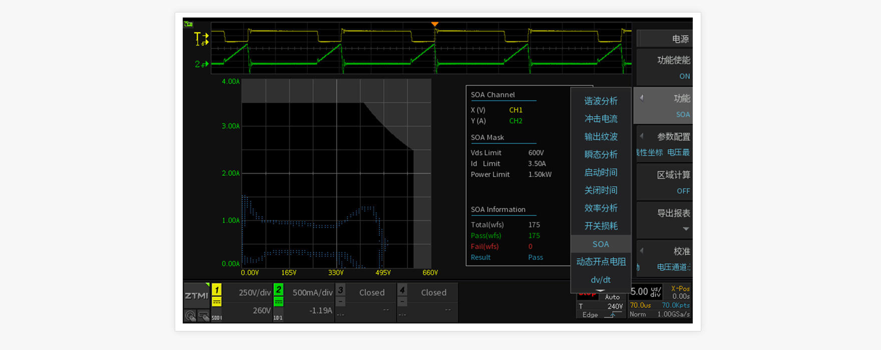 開關器件長期承受較大功耗,一但過壓或過流就可能會導致器件損壞甚至爆炸。雖然器件手冊中明確標注了IDM和VDS各項參數,但常規調試手段無法對器件的整個工作周期進行評估。通過ZDS3024定制的SOA安全工作區測量功能,可以準確評估整個工作周期內開關器件的所有狀態,明確給出電源超出安全工作區的異常概率,便于工程師更好的評估電源工作穩定性。