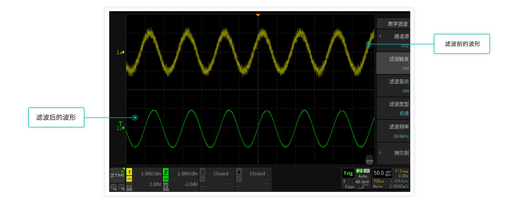 存儲深度等于采樣率乘以采樣時間,512M大存儲深度,長時間捕獲波形,依然不會出現波形失真。