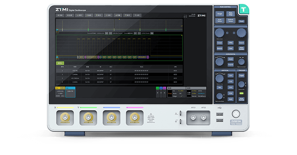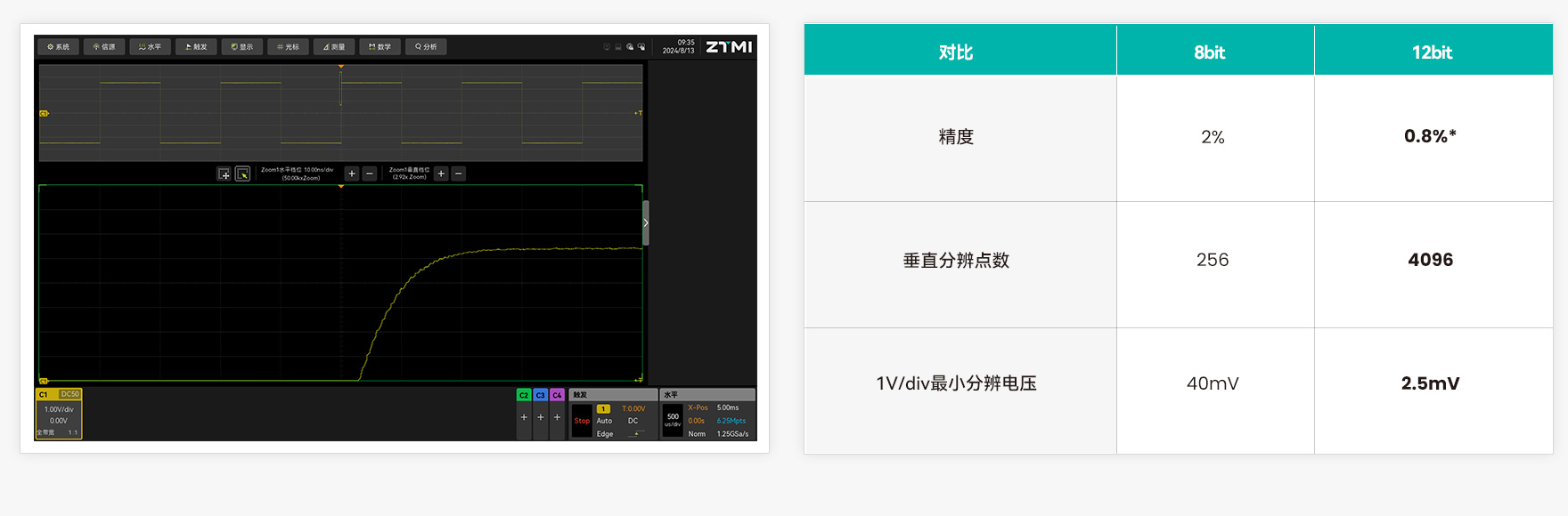 示波器的ADC 位數(shù)越高,波形的垂直分辨率就可以越細,就可以看到更多的波形細節(jié)。ZUS6000 采用12bit 高速ADC,垂直分辨點數(shù)達到4096點,測量精度達到0.8%,可以精準地觀察到更微小的波形變化。