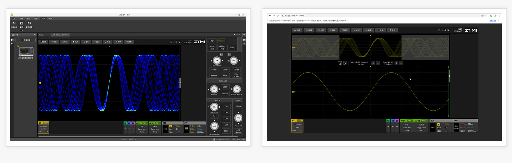 為了更方便工程師對示波器的的操作以及對波形數(shù)據(jù)的處理,ZUS6000同步提供全新一代MTA上位機軟件和全新的web遠程服務(wù)器功能,幫助工程師進行遠程控制示波器,讀取示波器波形,甚至實現(xiàn)腳本文件編程下發(fā),實現(xiàn)示波器快速二次開發(fā)的應(yīng)用。