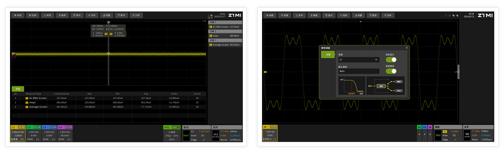 提升示波器ADC采樣位數(shù)的同時,需要降低示波器本底噪聲對實測信號的影響。ZUS6000 示波器不僅擁有良好的本底噪聲(50Ω阻抗實測為137μVrms),還提供無級FIR 濾波器,可在10Hz-500MHz 之間設(shè)置任意濾波頻點,濾除無效信號。