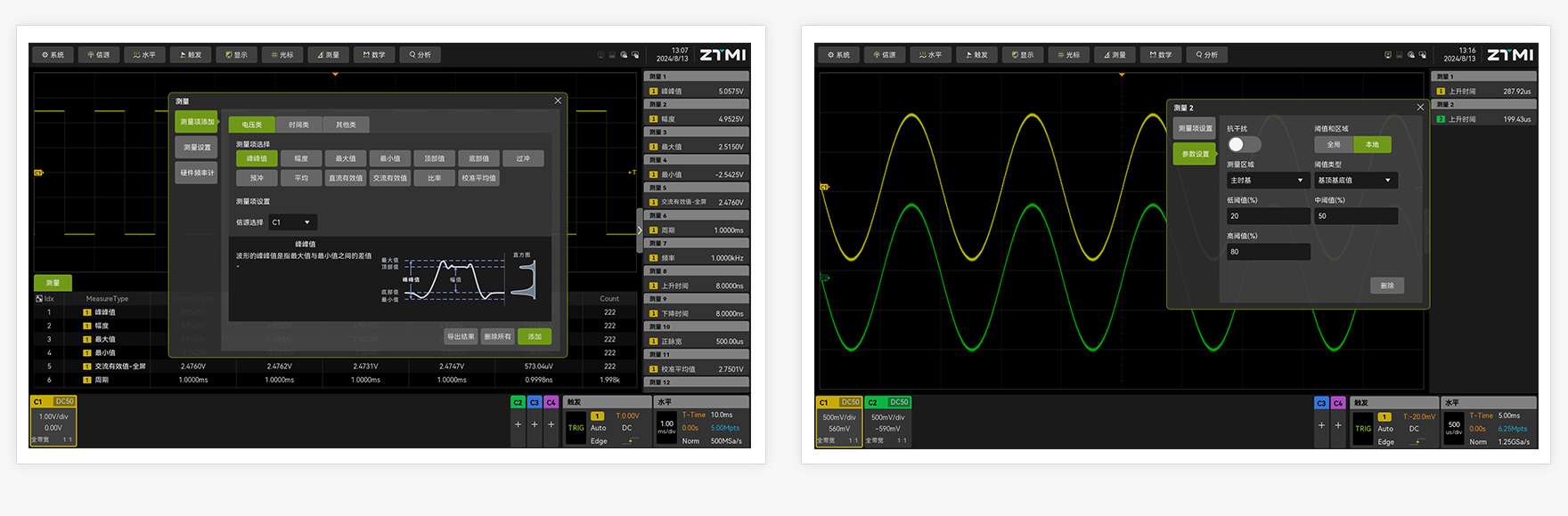ZUS6000支持同時增加多達4個不同公式的波形運算,不同運算結(jié)果可以顯示在不同的波形窗口,讓工程師看到更多的視角和細節(jié)。運算通道可以選擇顯示與隱藏,同時不影響運算的正常進行,操作靈活,滿足更多場合需求。