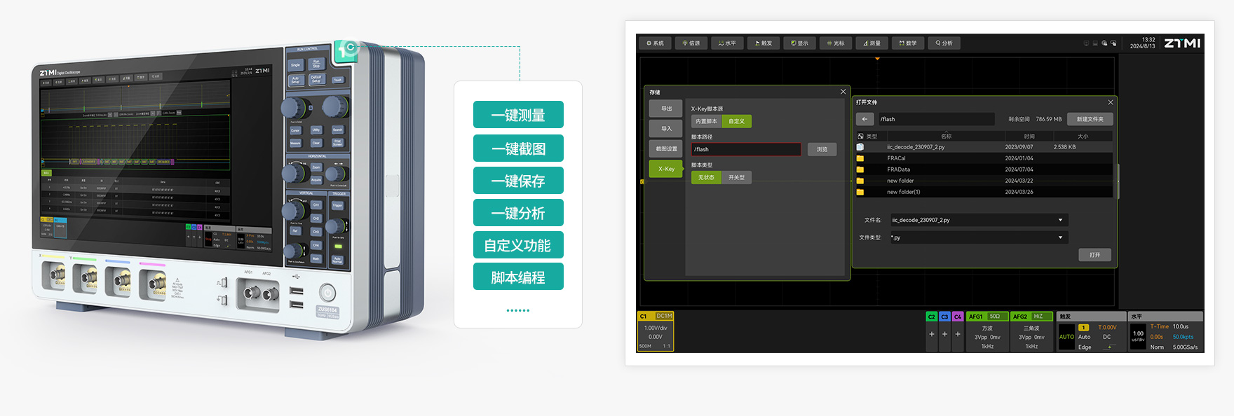不同工程師使用示波器有不同的習(xí)慣操作,為了滿足不同工程師的習(xí)慣需求,ZUS6000創(chuàng)新性的推出了自定義按鍵X-Key,工程師可以通過X-Key定制示波器操作、參數(shù)測量、波形保存、腳本分析等各種動作和功能,給您更多的自由選擇。